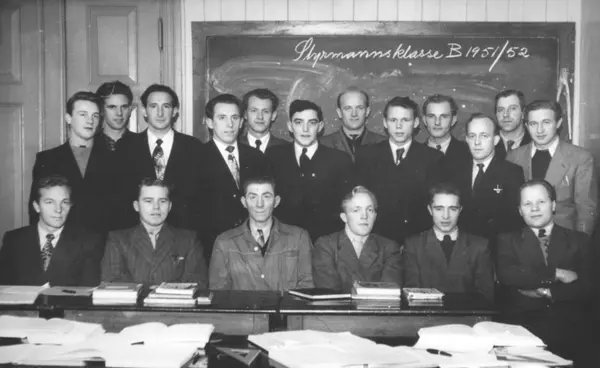 På tavla står det en tekst: "Styrmannsklasse B 1951/1952".